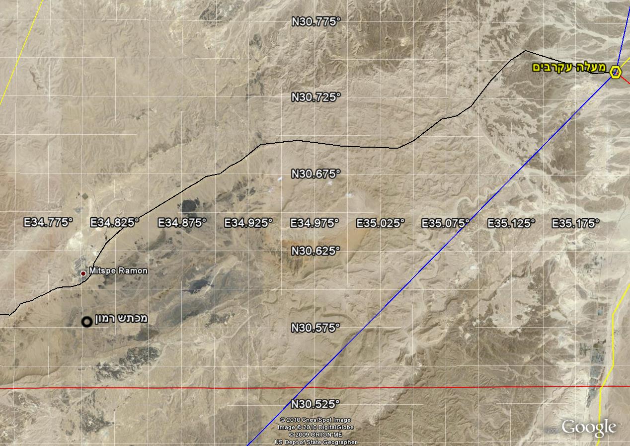 35.4462094/31.461101, 18 מיל מערבה מסוכות ו- 38.5 מיל אחר כך דרומה, אמצע גבול