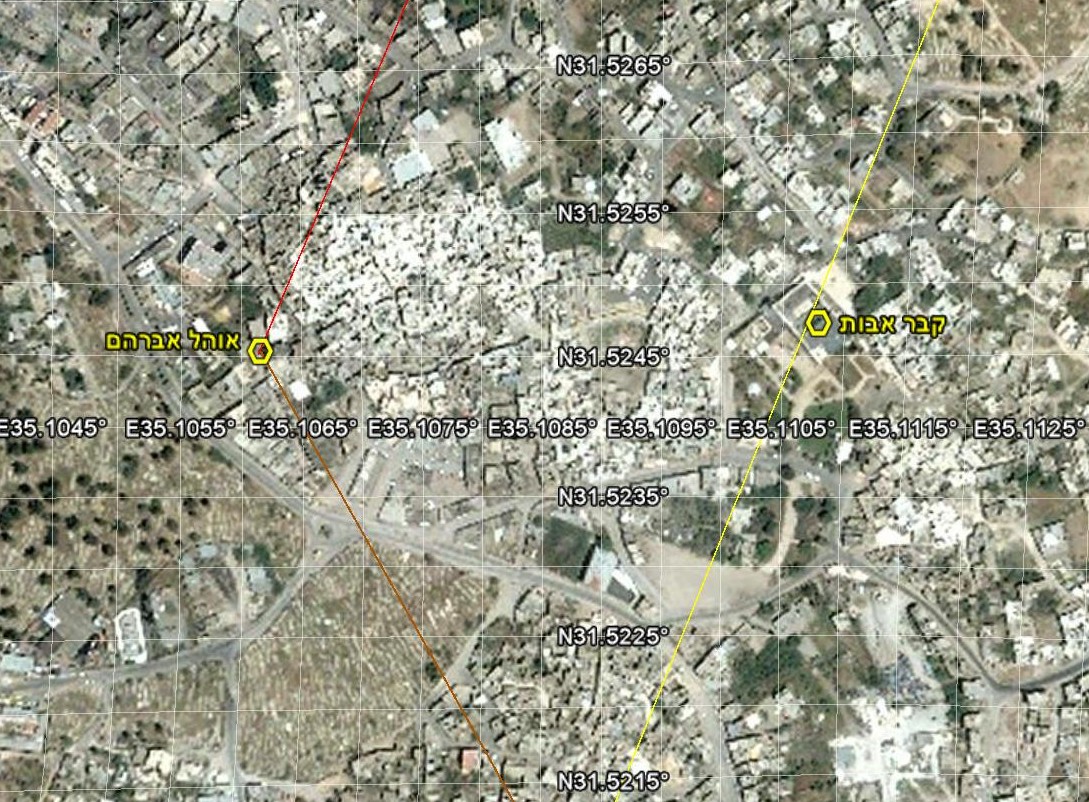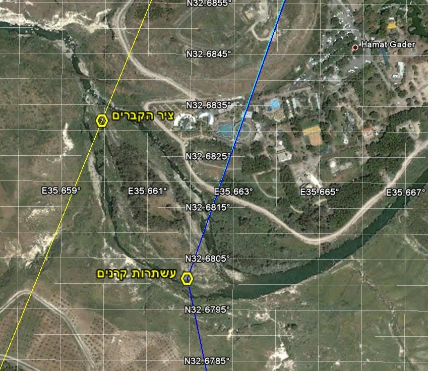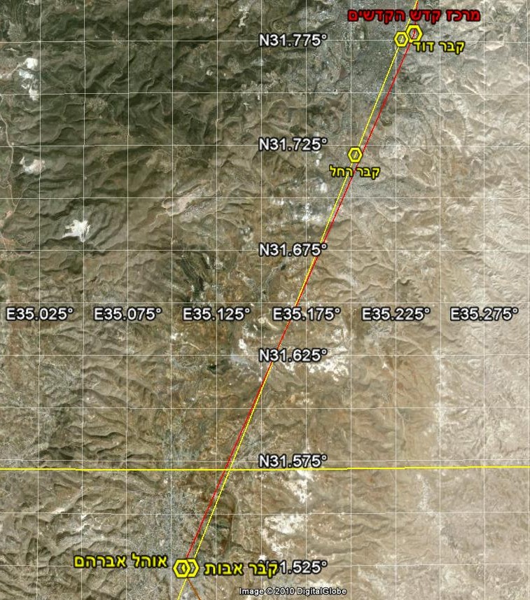 35.2287223/31.7771394. זאת נקודת חיתוך של ציר הקברים העובר דרך נקודות 3 ו-4