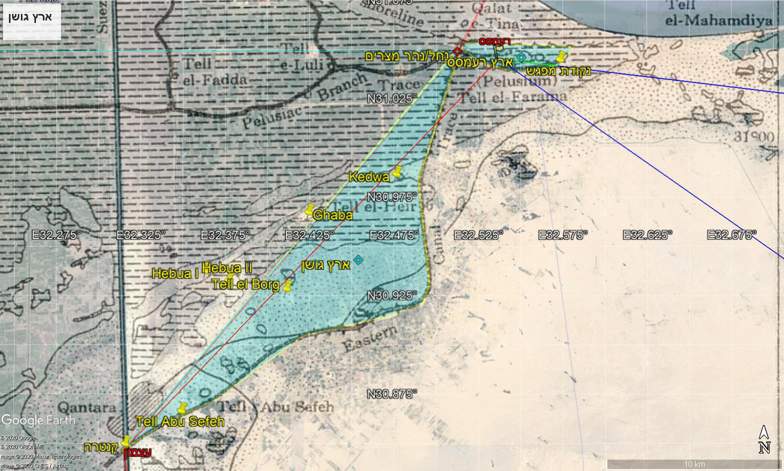 גושן אשר מוזכרת ביהושע י' מ''א). לכן בהכרח ארץ גושן נמצאת ממזרח לקו הגבול. מאידך הם ישבו